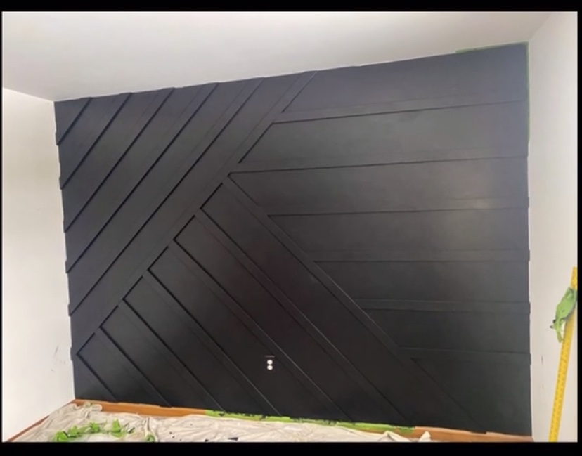 I did not like the board and batten and I painted it all black hoping it would make it better. It didn’t. So I painted it white. I still didn’t like it. Next, I tried to paint a pattern on the board and batten. I did like an arrow shape where I dipped the end of a sponge into the paint and dabbed it on looking like a ^^. I got my inspo from people who DIY their own wallpaper with patterns. But mine did not turn out acceptable lol.