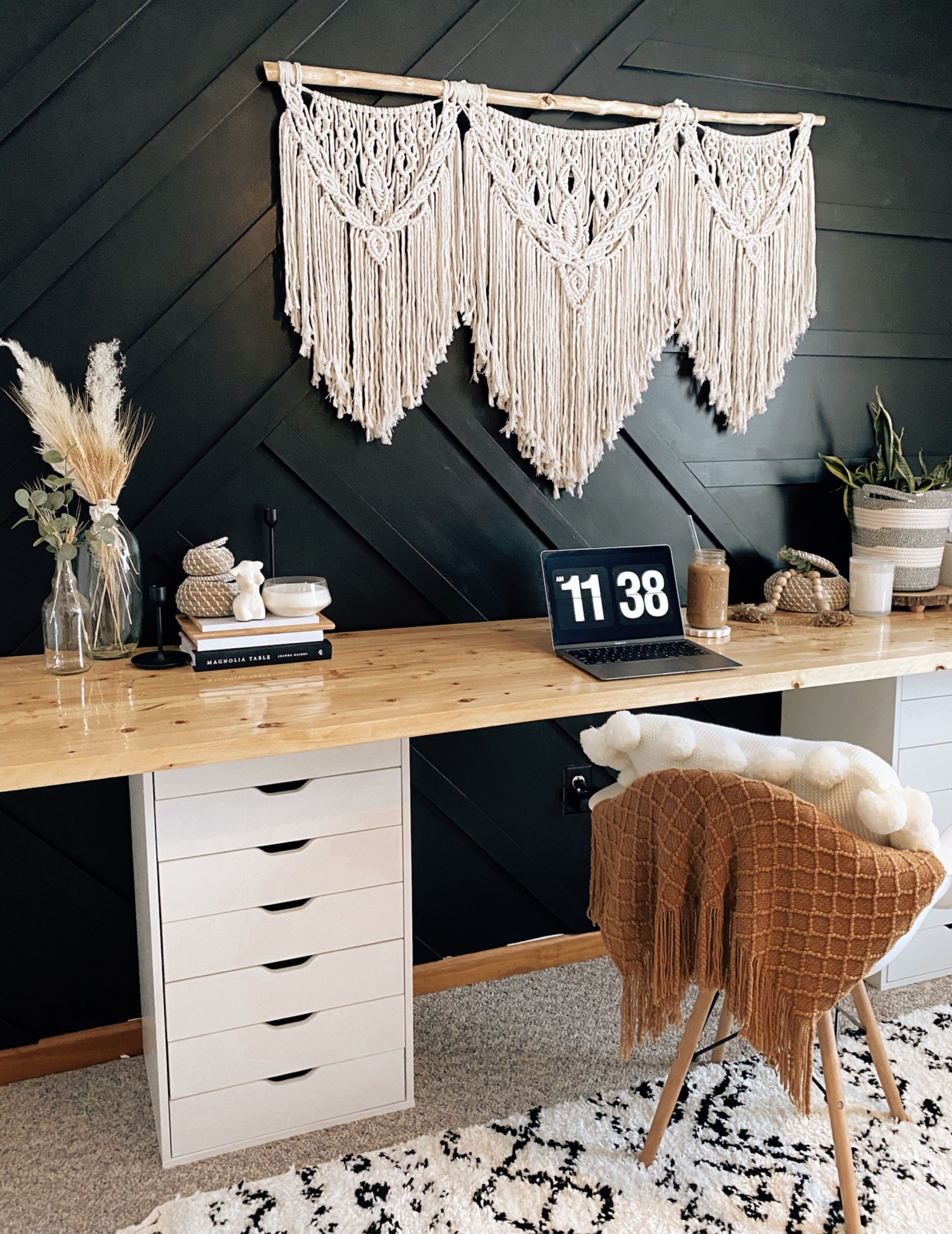 15- I put together the two furniture draw sets. Then we placed the desk top on it. The rug came in, put the chair together. Hung the gallery wall, I decorated and hung the light fixture. Finally we hung the beautiful macrame wall hanging for the finishing touch & then I posted the reveal!!! Here are some pictures!! 😍😍