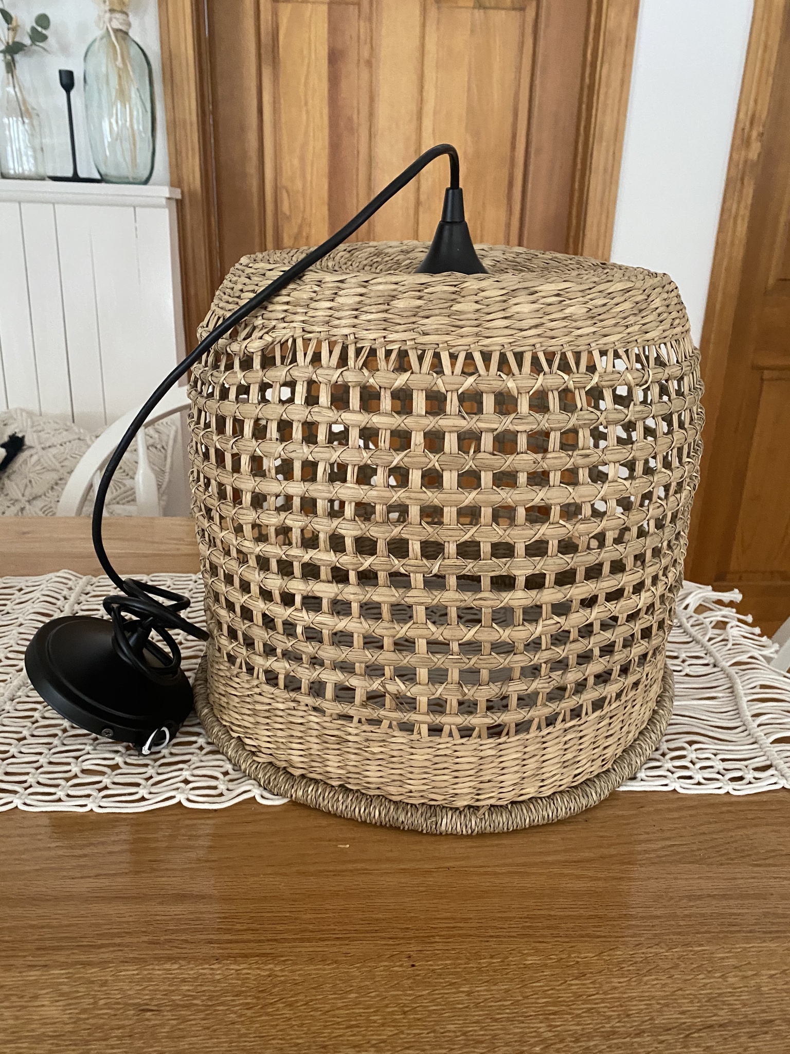 9- Light fixture— I did a basket light hack for the rattan chandelier for hen office. I used a basket that had a rounded shape from target. I searched for a basket that didn’t have a square bottom or firm 90 degree angle so that I could hang it upside down and put the pendant light sting in it.